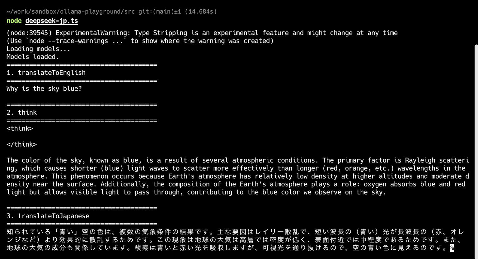 TypeScriptファイルを実行すると、LLMの出力を確認できます。